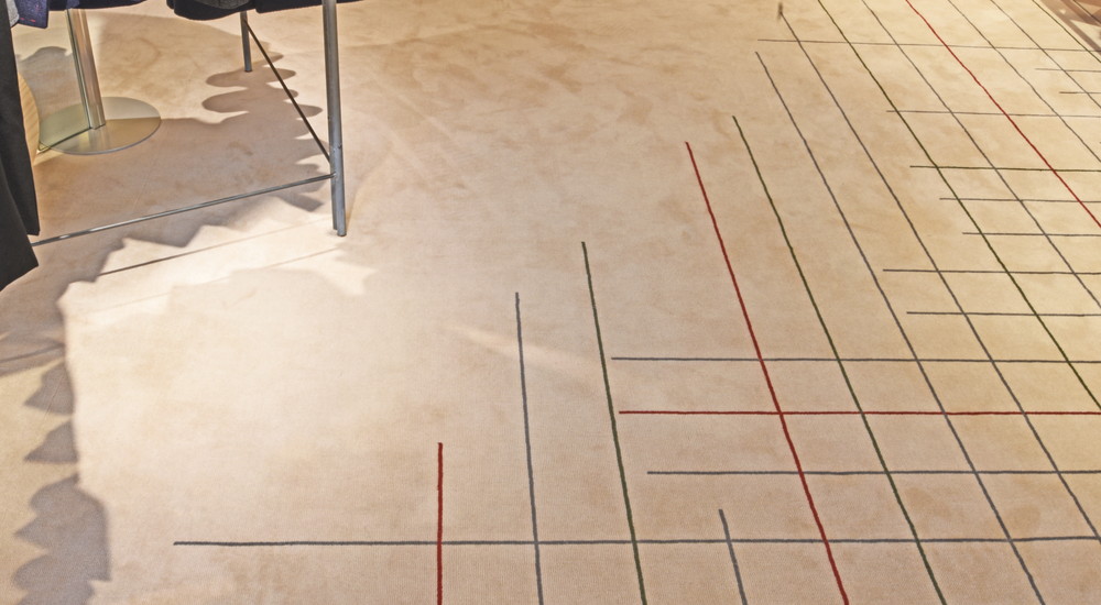 今回のフロア絨毯も大阪店同様堀田カーペットさんに依頼し、別注を敢行、大阪店はダイアゴナル状に柄を配置していたのに対し、東京店は京都の町並みを表現する碁盤目状を採用、各ゾーンのイメージカラーをミックスしています。