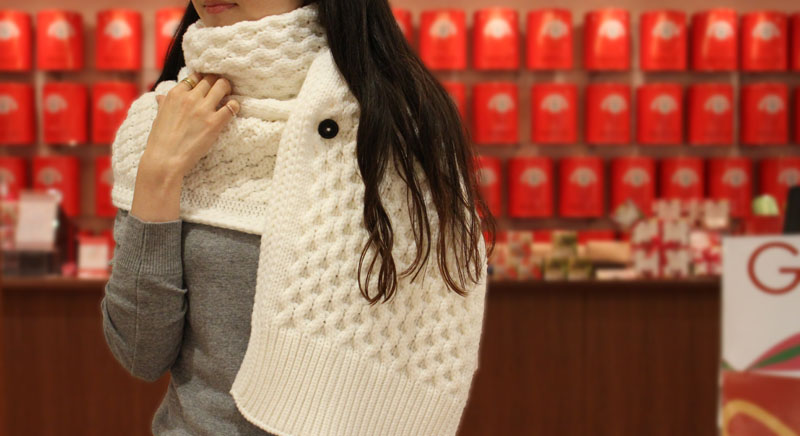 ボリュームのあるデザインが今年顔のケーブル編みのニットマフラー。ローゲージながら、しっとりと柔らかい素材を使用しているので着心地も滑らか!ボタンの使い方次第ではジレにもなり、アレンジ豊富なので様々な表情とコーディネートが楽しめます。