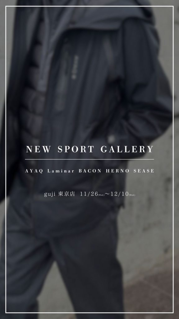 本日は、イベント告知と商品紹介になります。 まずは何のイベントかと言いますと、11月26日(水)-12/10(水)の期間で、グジ東京店にてタイトルにもある”NEW SPORT GALLERY”と題して、新しいスポーツを感じる、アウター・ウェアーブランドを一同に集結させたポップアップイベントを開催しております。