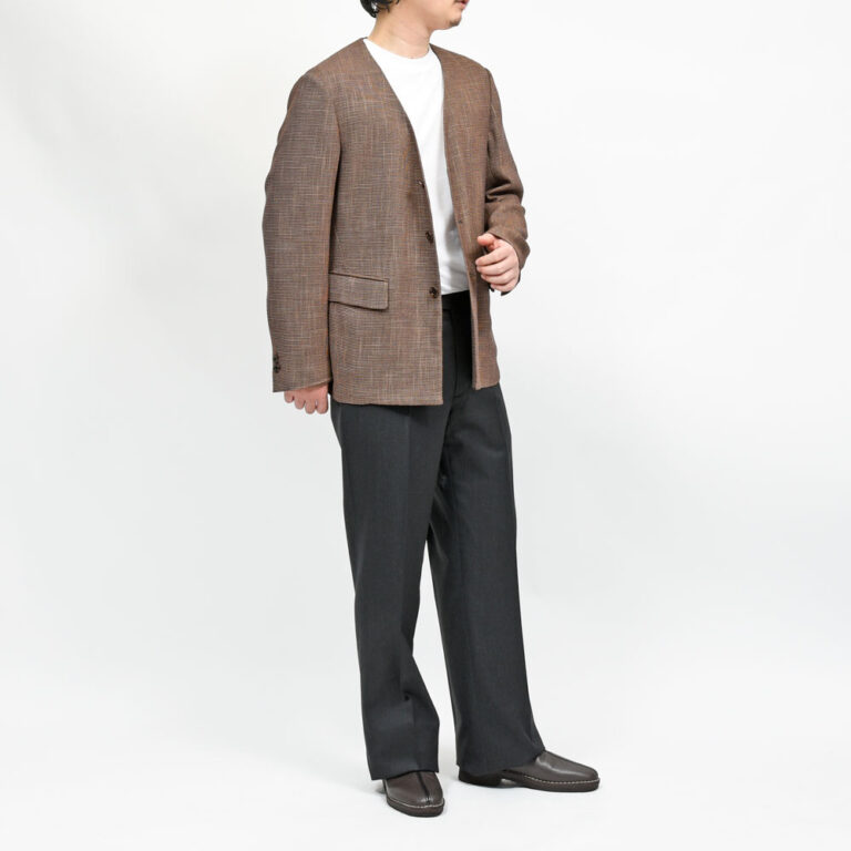 la favola(ラファーヴォラ)らしいノーカラージャケット、テーラーリングを得意とするブランドであり、カジュアルにも精通したデザイナーならではのエッセンスが感じられる一着になっています。