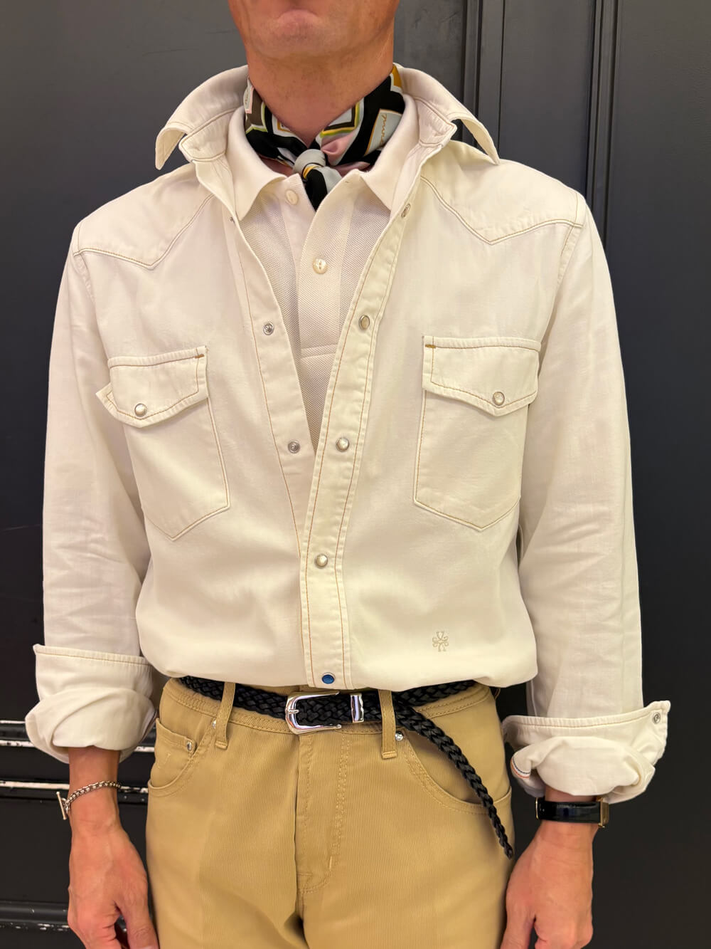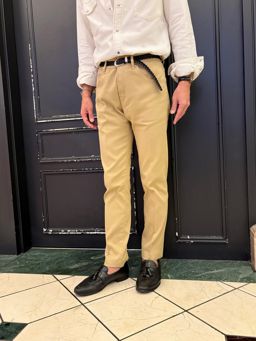 無骨なシャツをアイボリーで揃えてトーンを上げたパンツで品の良さを引き立たせます。