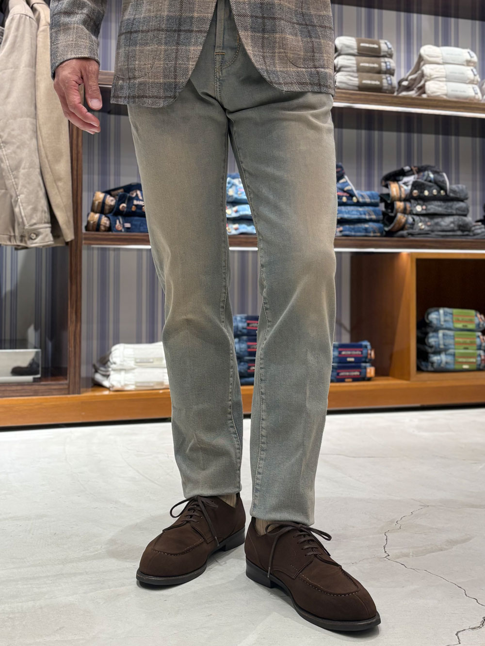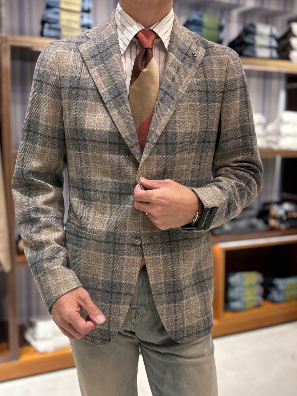 淡色チェックジャケットをトレンドカラーtieでメリハリをつけるスタイル。
