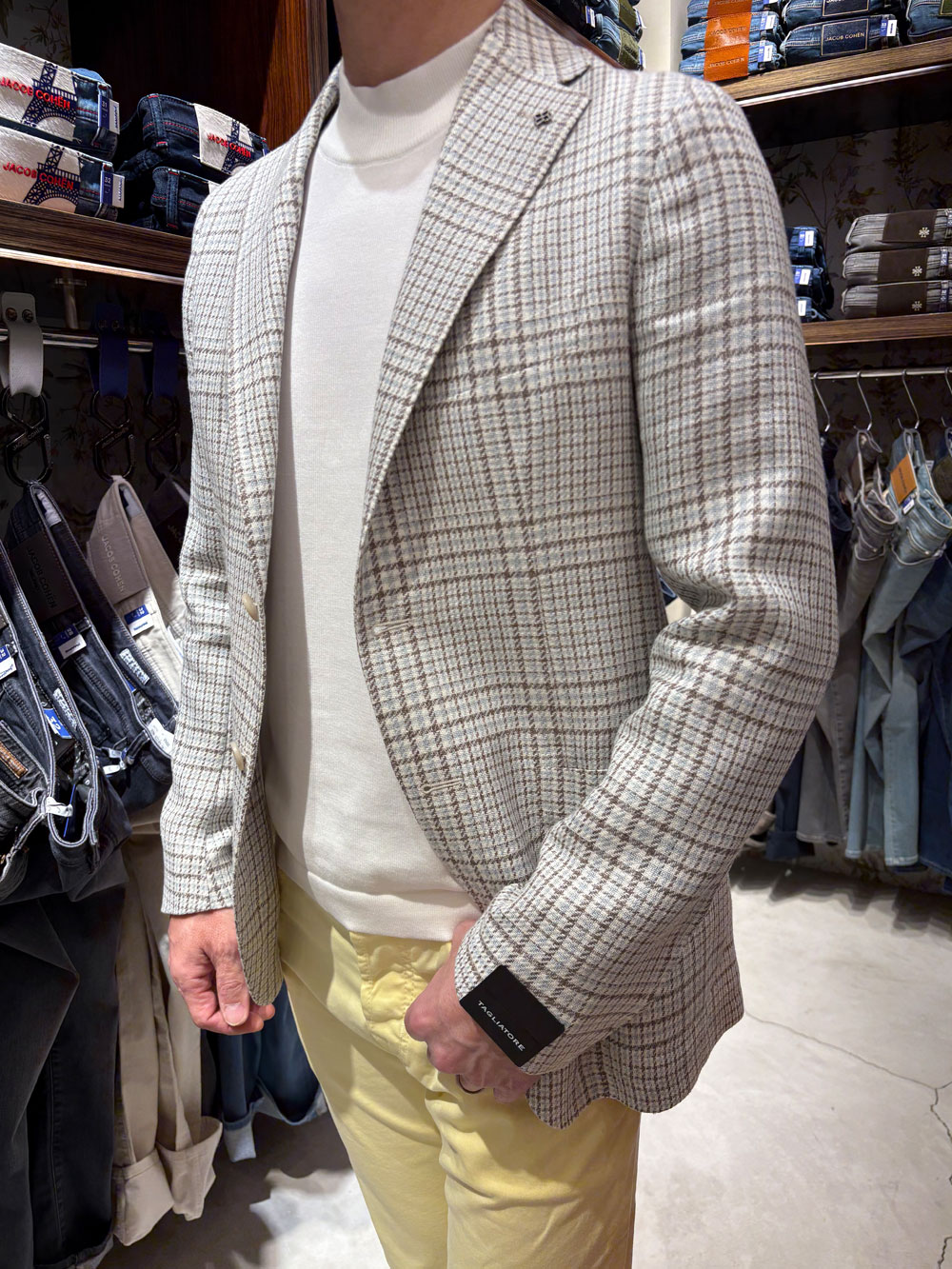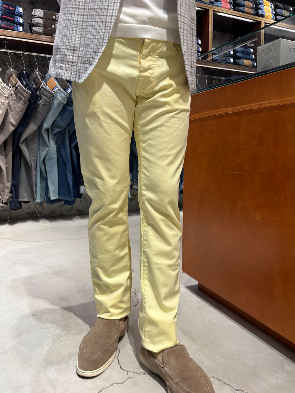 ライトなカラーのパンツにジャケットとコットンモックネックで上品なバランスに。春のランチから美術館までを満たせるスタイリング。