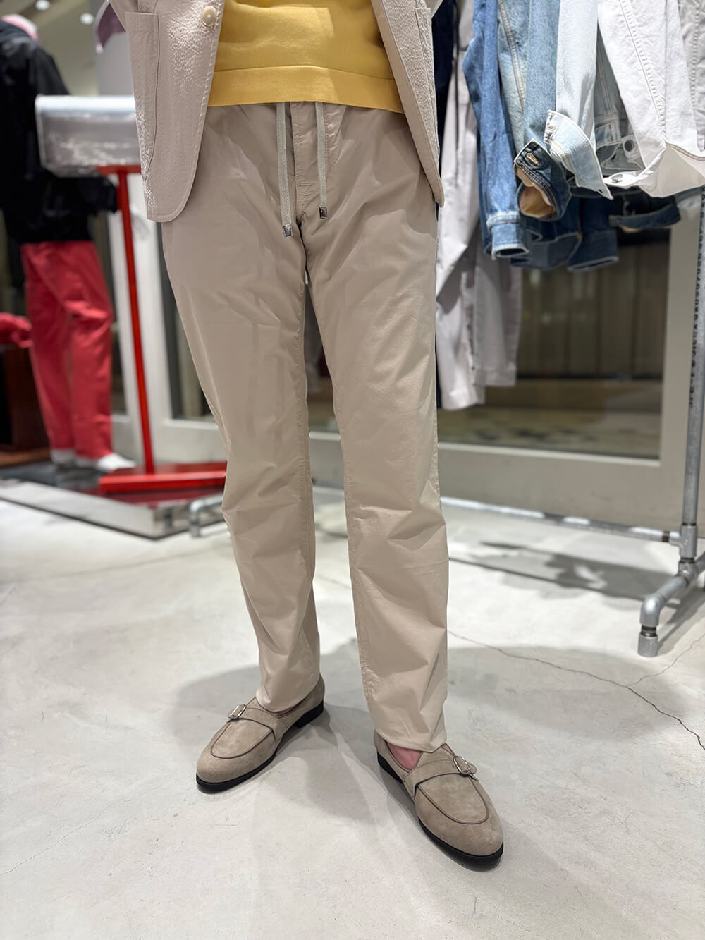 Jacob Cohenの綺麗見えactive素材パンツをメインにジャケットスタイリング。 スニーカーを合わせるのも○です。今回はベージュトーンにシングルモンクでポイントを作りました。春から初夏はこのような感じで出かけたい。