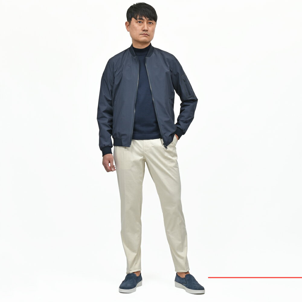大人の男性の為のシンプルなボマーブルゾンで、スマートなシルエットとミニマルなディティール、そして機能的な素材使いが特徴のモデルです。