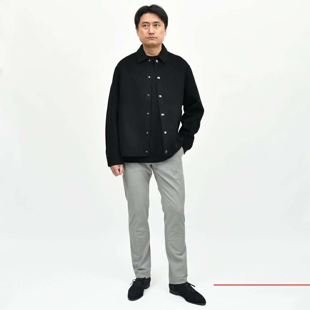 シンプルなコーチジャケットタイプ、スナップボタンでフロントを留めるカジュアルなデザインですが、襟付きなので一定の品格が備わっており、さらにウールカシミアのダブルフェイスで仕立てることでグッと優雅に仕上がっています。