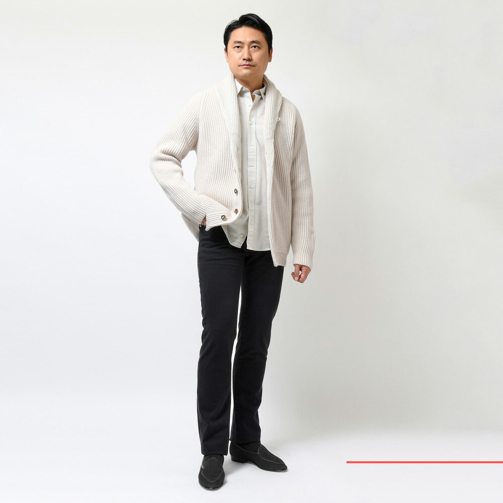あくまでもカジュアルなニットとして作られていますが、ウールパンツからデニムやチノなどのワークパンツと合わせても上品にまとまります。大人のベーシックなニットウェアとして、これよりも上質でコンフォートなものはまず存在しないのではないでしょうか。