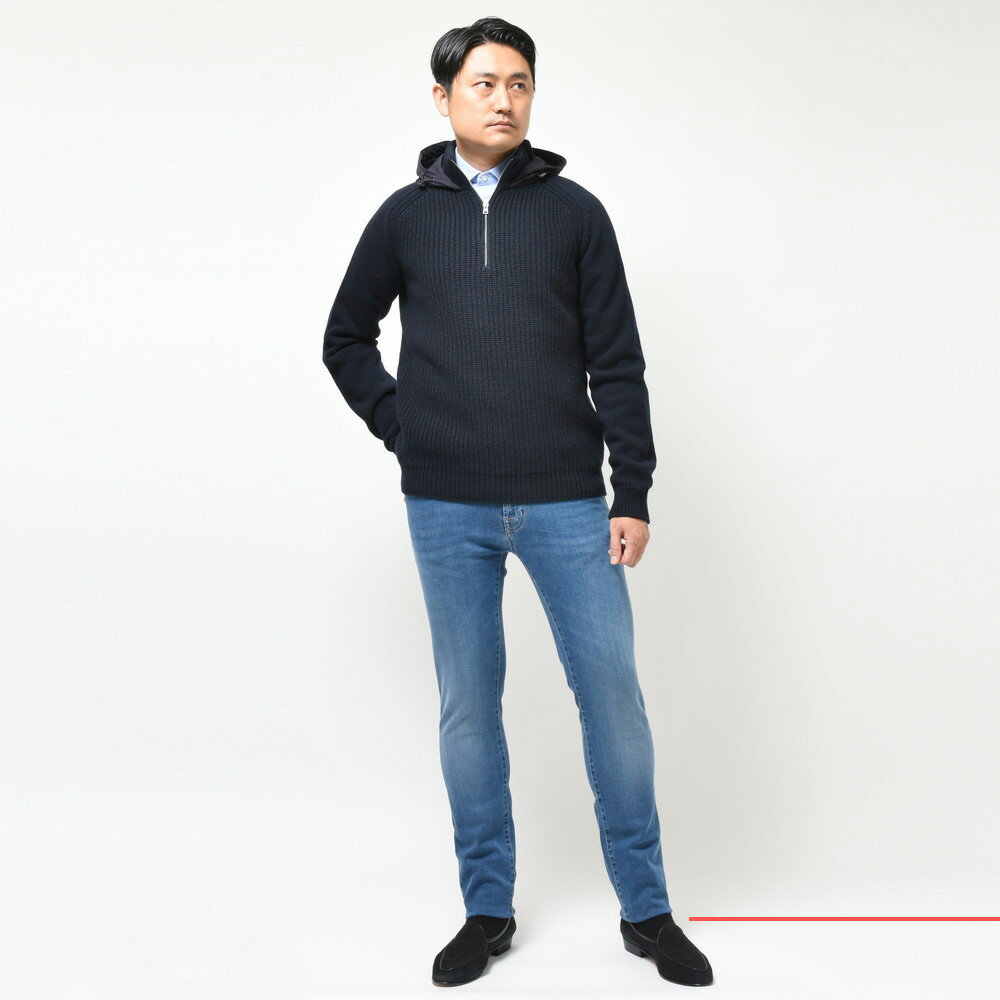 HERNO(ヘルノ)の“旅”をキーワードに、ラグジュアリーなルックスとコンフォート性能に特化したコレクション“HERNO RESORT”、ローゲージニットウェアは巧みな編地の切り替えと、HERNOらしい素材の切り替えで表現されたプルオーバーフーディーです。
