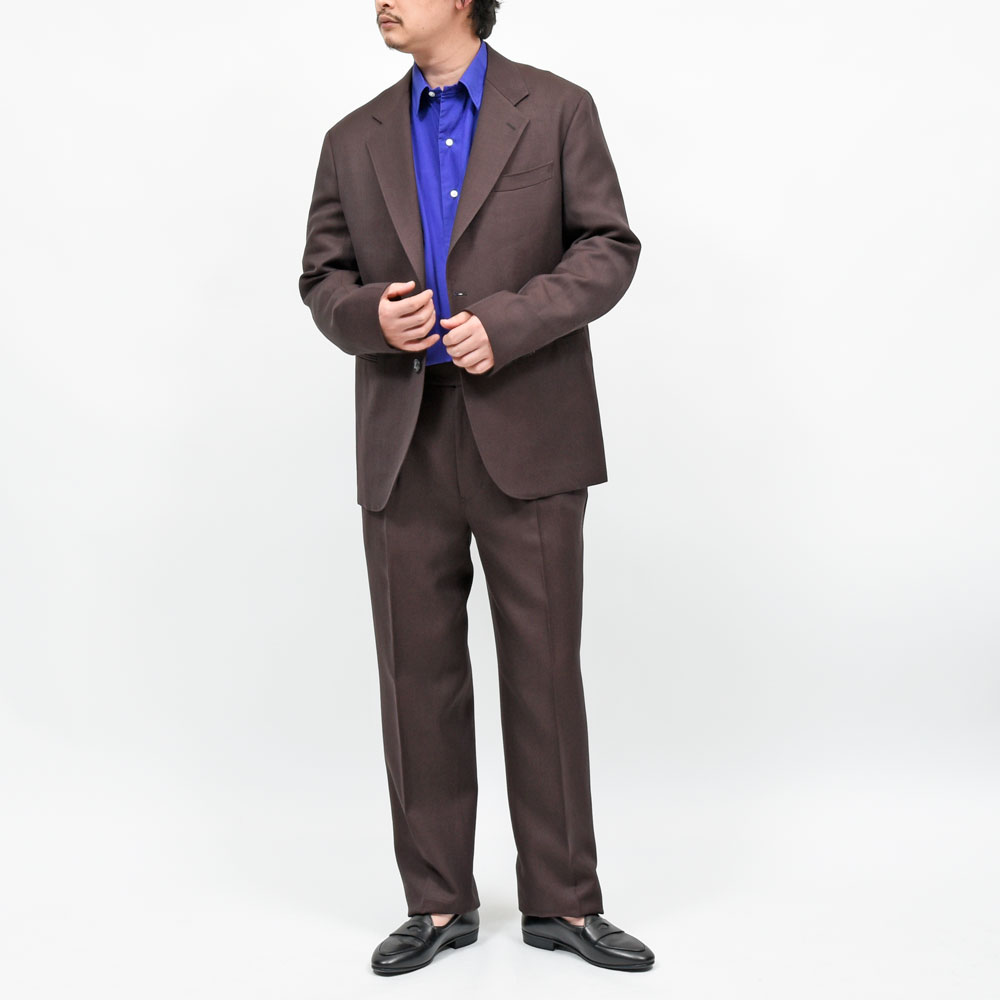 生地はイタリアのファブリックを採用、ウール65%リネン35%の程よく肉感がありソフトながらもシャリ感がある春夏シーズンにフィットした風合いのものになっています。特徴的なシルエットの良さを上手く引き出しながらバランスが取られている印象。