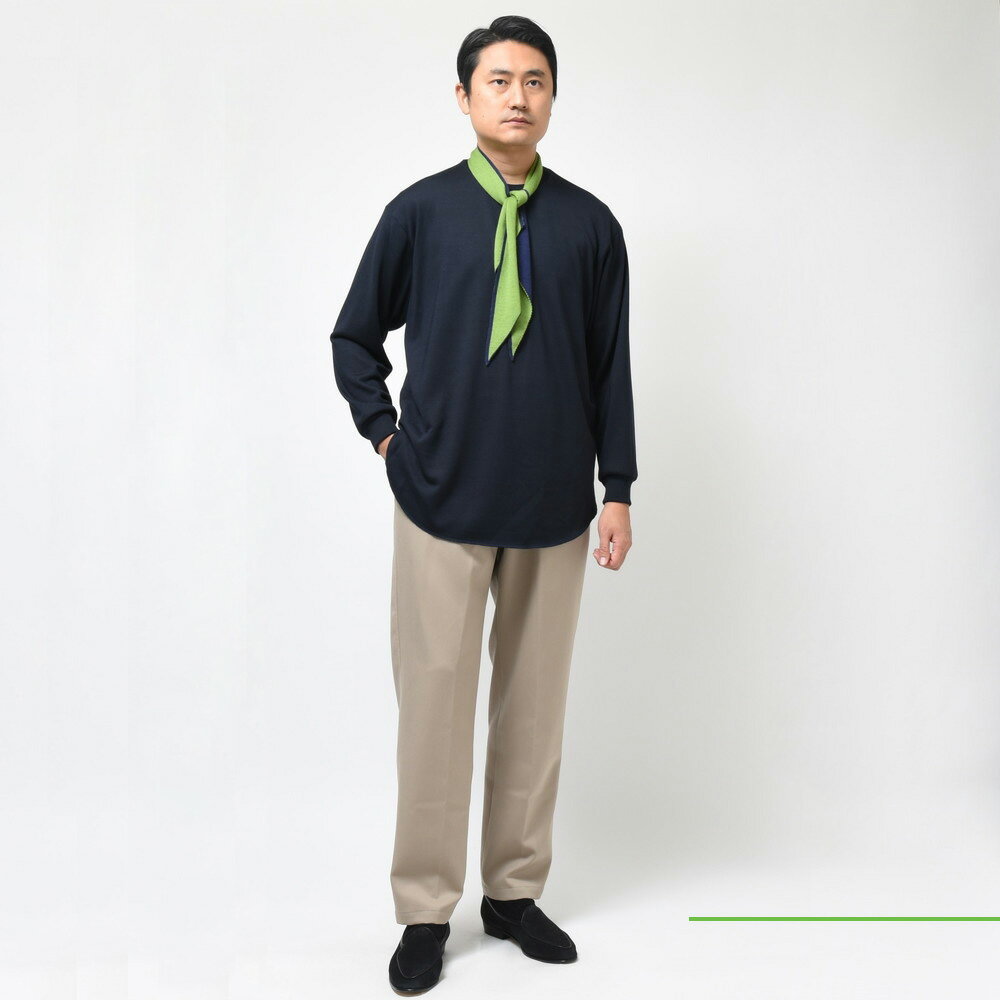 今回最もラグジュアリーなのはこちらのスウェットです。生地はウォッシャブル加工を施したシルク100%の裏毛生地を採用、もちろん袖口と襟ぐりのフライス生地もシルクになります。立体裁断で作られたシルエットは特に裾のカッティングが美しく、ドレープ感のある動きが雰囲気を更に良く魅せてくれるので、ただ着るだけでムードのあるスタイルになるんですね。