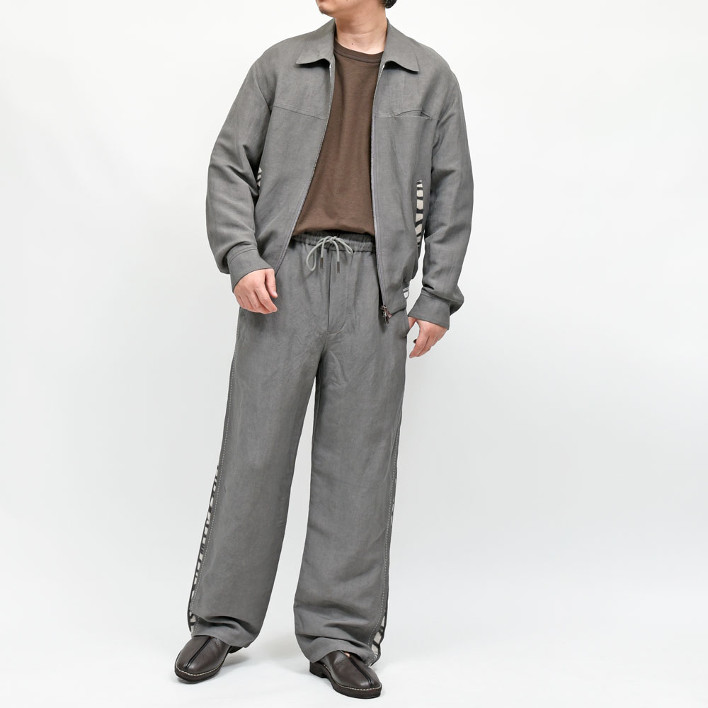 mando(マンド)らしく硫化染された一着、グレーから覗く白っぽさが何処か退廃的なムードを感じさせつつ、ポケットの淵にセットされたゼブラ柄がアクセントになることで少しポップな印象もあるデザイナーズならではの仕上がりに。
