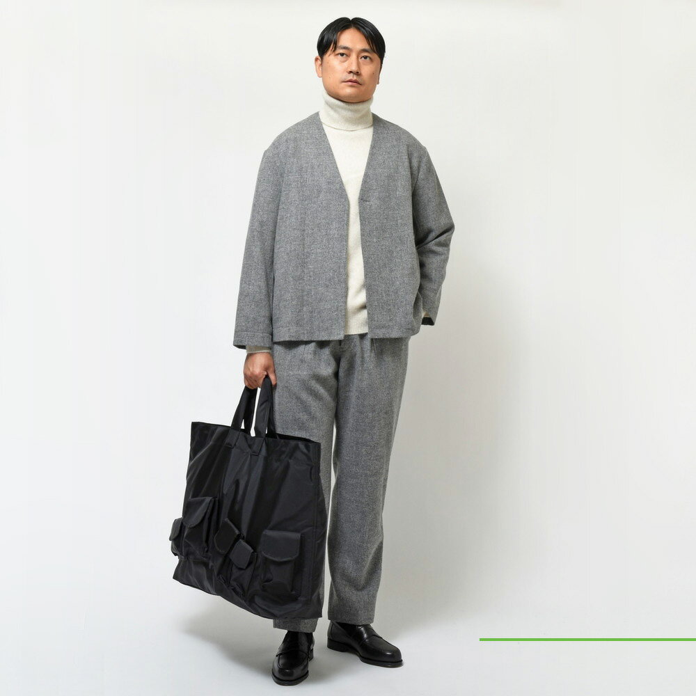 素材はツィードを採用、所謂英国的なガシっとした硬さのあるタイプではなくウォーム感はありつつも程良く軽さのあるものを選定。ボタンレスのデザインなのでエアリーさを出すためにはこの生地感がベストだと思います。