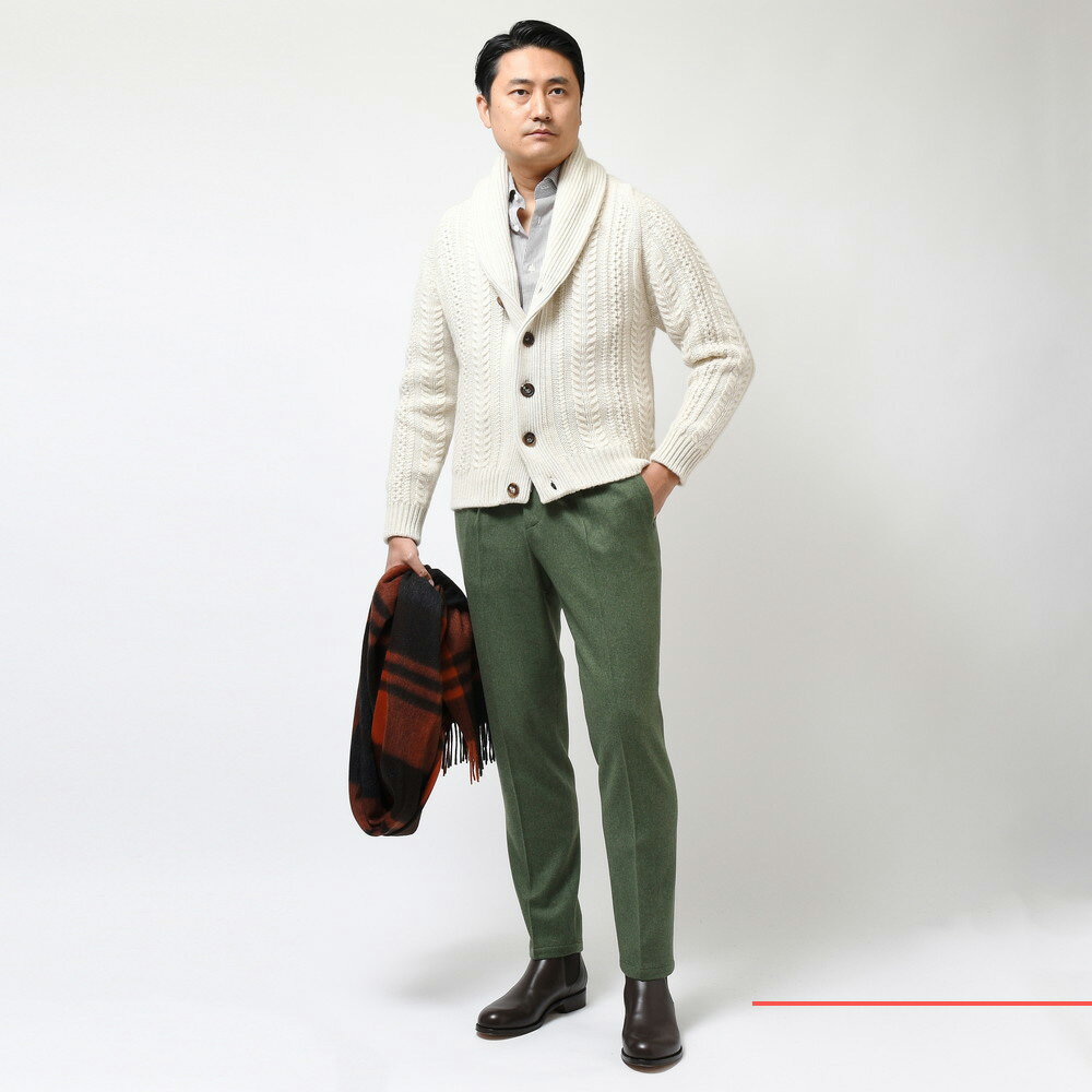 編み柄の立体感や表現が繊細で、土地柄フィッシャーマン系の雰囲気を想像したりするんですが、そこはBEGG X COということで全くタフさを感じさせない極めてエレガントなものとなっています。