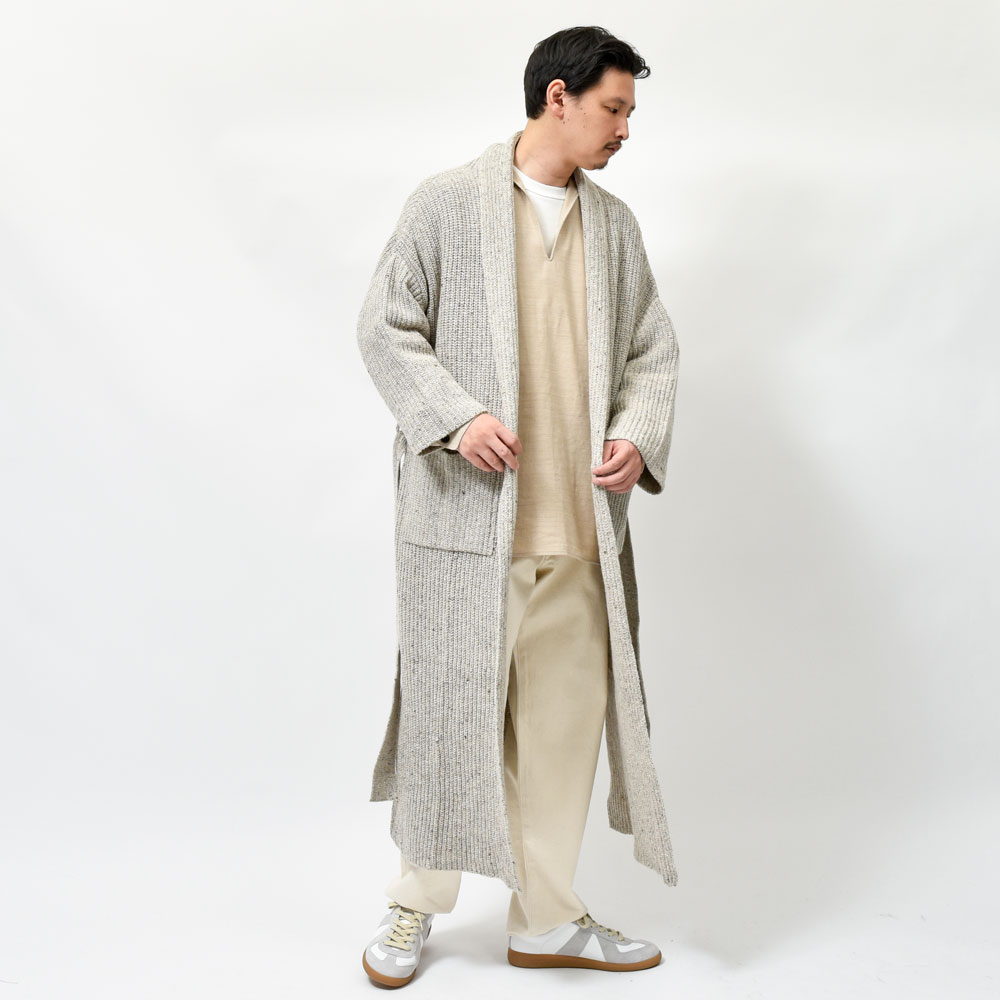 比較的ざっくりとした編み地に着丈はしっかり長め、これだけでかなりの存在感を発揮しています。またメランジになることでよりカジュアルなムードが感じられ、ガウンコートにありがちな色気をやや抑えている印象です。この辺の表現と言いますかセンスは流石だと思います。