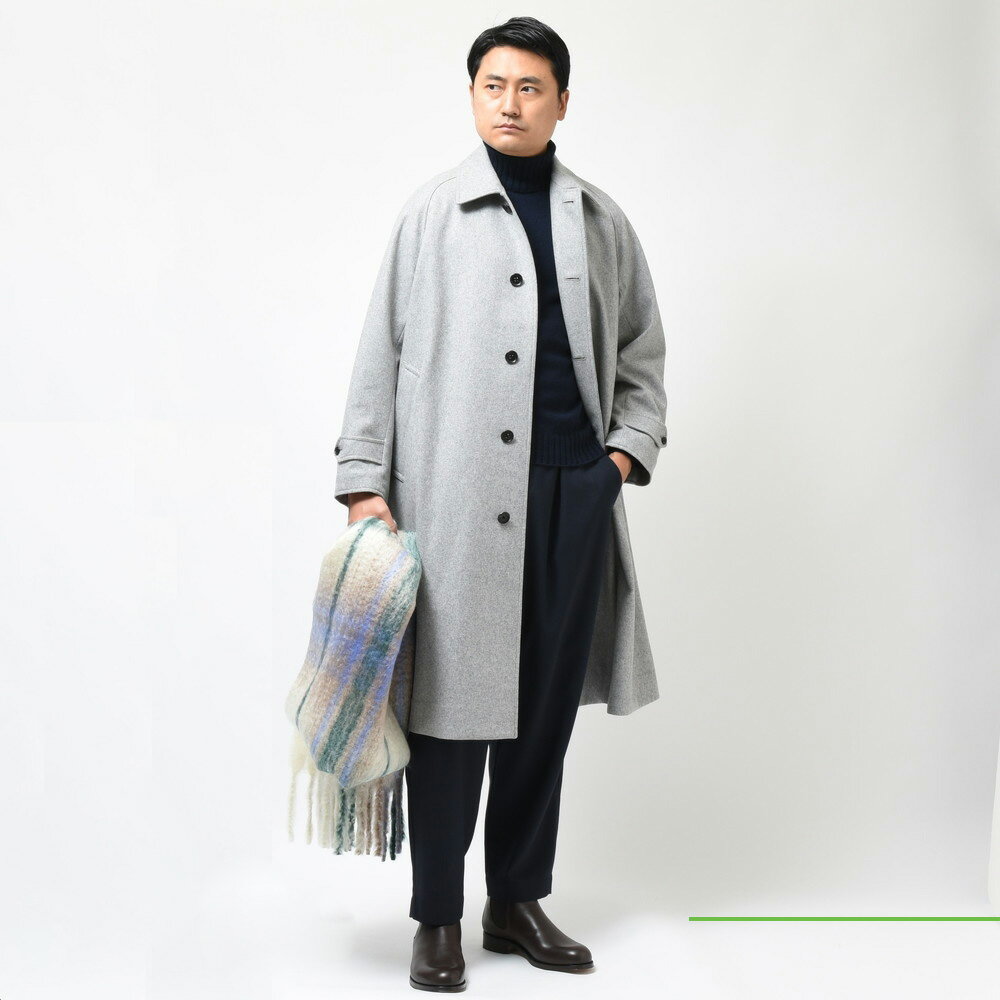 balcone la favola(バルコーネ ラファーヴォラ)にて定番的に展開させていただいてるバルカラーコート、今回は滑らかさのあるウールフランネル生地をチョイスしました。発色も非常によくライトグレーの色合いが全体的に余裕と品格をもたらしてくれるののに一役買っている感じですね。
