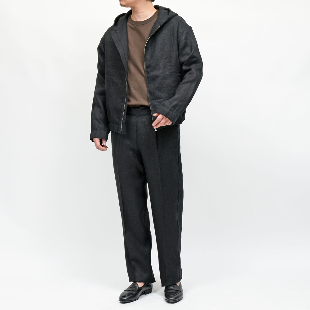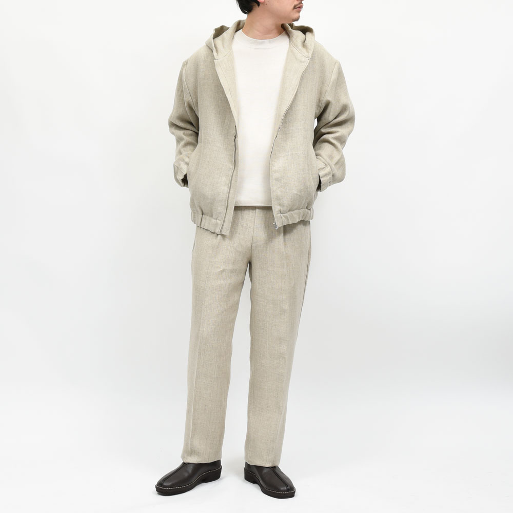 アイテムとしては非常にシンプルなフーディブルゾン、ざっくりとした見栄えでありながらも実際のタッチは非常に滑らか、それに呼応するように程よい光沢感も持ち合わせているため、カジュアルアイテムながらも抜けすぎない印象になっています。