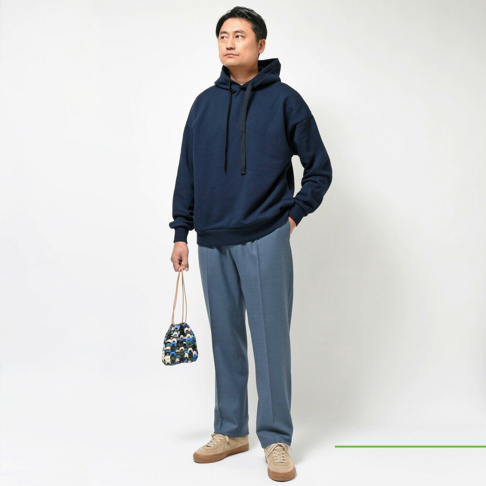 オーバーサイズのコートやショートブルゾンと合わせて頂くとバランス良く収まりますし、一枚で着てもフードを絞る平紐が絶妙なアクセントになり、スタイルがキリッと引き締まるんです。