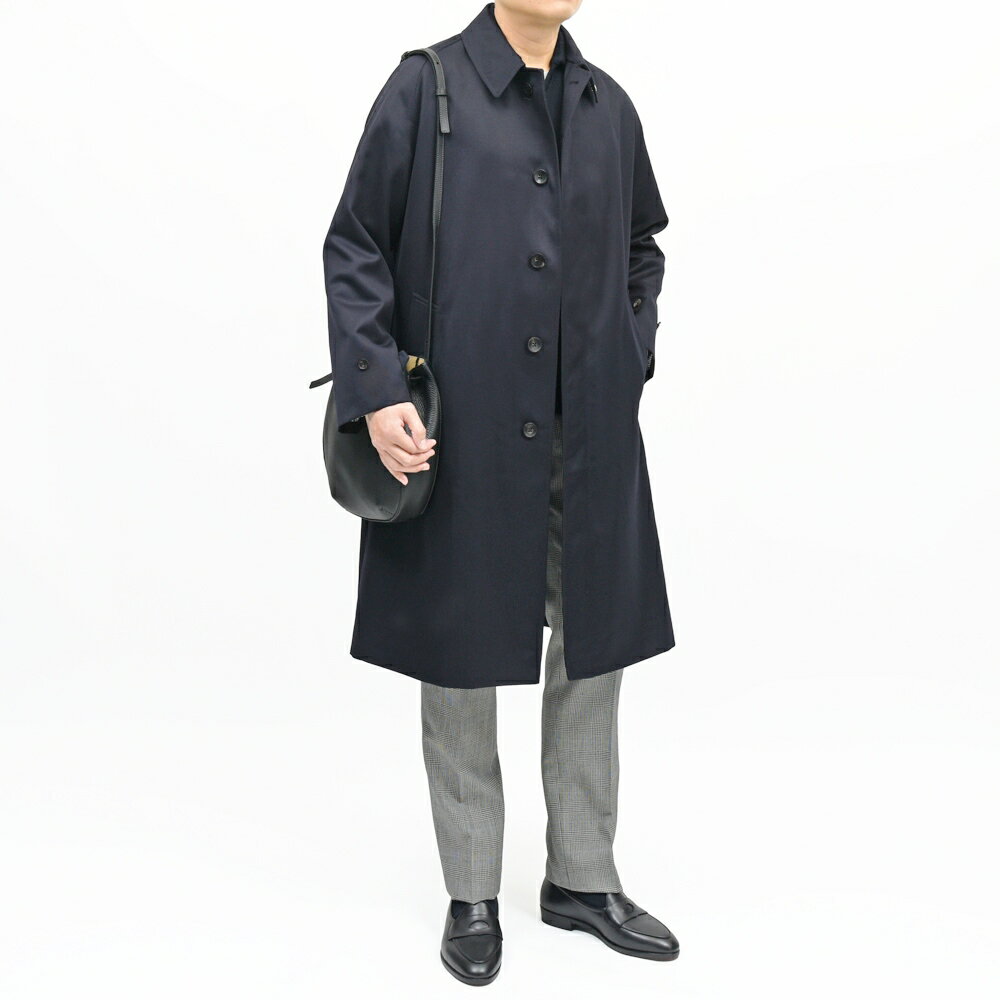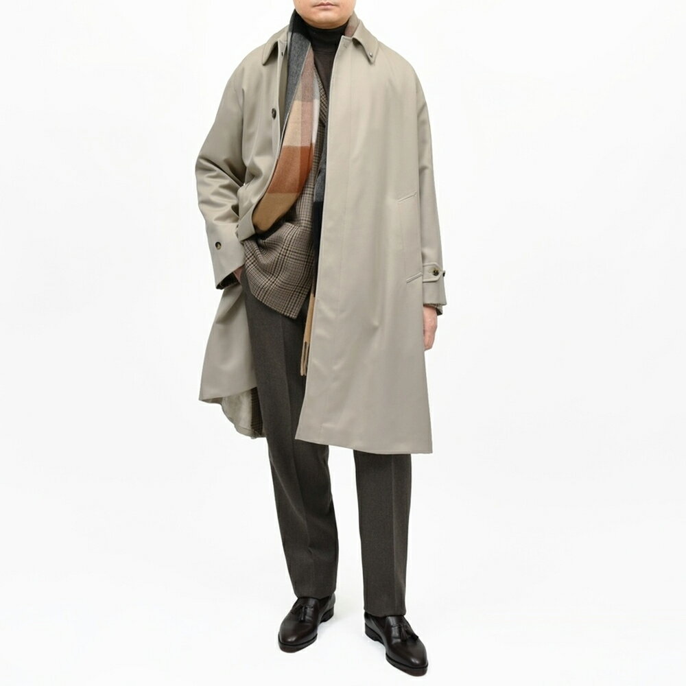 英国ブランドなので、打ち込みの良いキャバリーツイルがよく似合いますね。一枚袖でナチュラルに落ちるアームのライン、優雅に動く腰から裾にかけてのドレープ感が最高ですね。