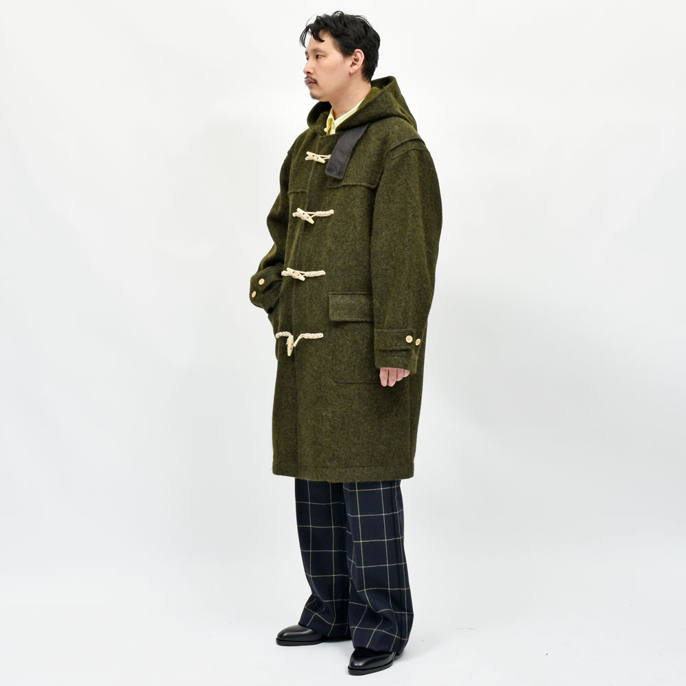 mando(マンド)のダッフルコート、縮絨ウールを用いたカーキグリーンの生地が目を惹く一着になっていまして、しっかりとウォーム感が伝わってくる生地使いになっています。シルエットは縦を意識したものになっていまして、袖、身頃もストンとまっすぐ落ちていくような形に。