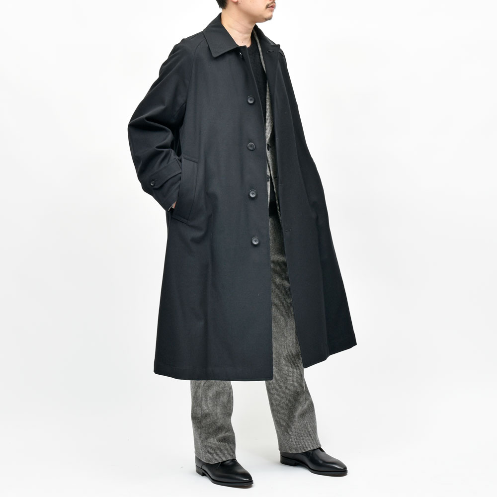 la favola(ラファーヴォラ)らしい美しいAラインシルエットのバルカラーコート、今シーズンはストイックな印象を抱かせるブラックでオーダーしています。生地はしなやかさとタフさを併せ持つウールギャバジンを採用。インラインにはないbalconeでのみ展開しているモデルになりまして、フロントボタンが比翼ではなく敢えて露出させているのもこのコートの特徴になります、感覚としてはほんのりカジュアル寄りにしています。