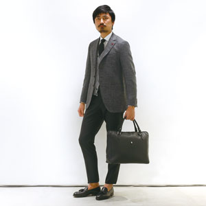 SUIT:RING JACKET ¥ 140,400 / SHIRT:CIT LUXURY ¥ 18,900 / TIE:STEFANO BIGI ¥ 17,280 / BELT:Anderson's ¥ 64,800 / POCKETCHIEF:MUNGAI ¥ 6,480 / BAG:CISEI ¥ 189,000 / SHOES:Crockett&Jones ¥ 85,320
